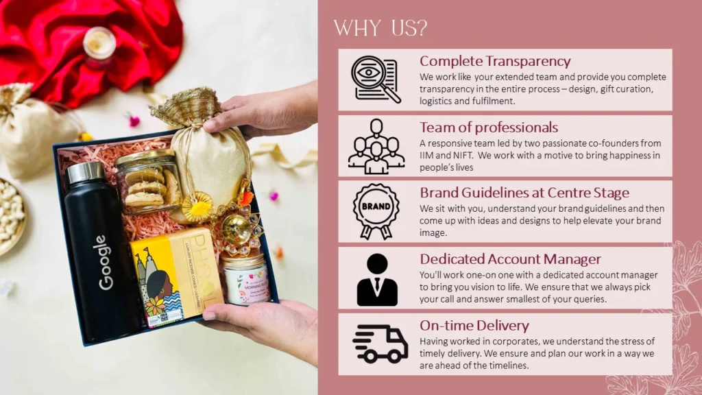 There are many reasons why you should choose us for all your gifting needs. HappyGifts offers a wide variety of gift hampers and baskets that are suitable for all occasions and recipients. We take pride in our professionalism and attention to detail, ensuring that all gifts are packaged and delivered to the highest standard. Also, understand the importance of timely delivery and ensure that all gifts hamper are delivered on time, every time. Our gift hampers are budget-friendly and will not break the bank, while still being of high quality. You can also create your own box as per your requirement. We provide good customer service to ensure you have a positive experience with us.