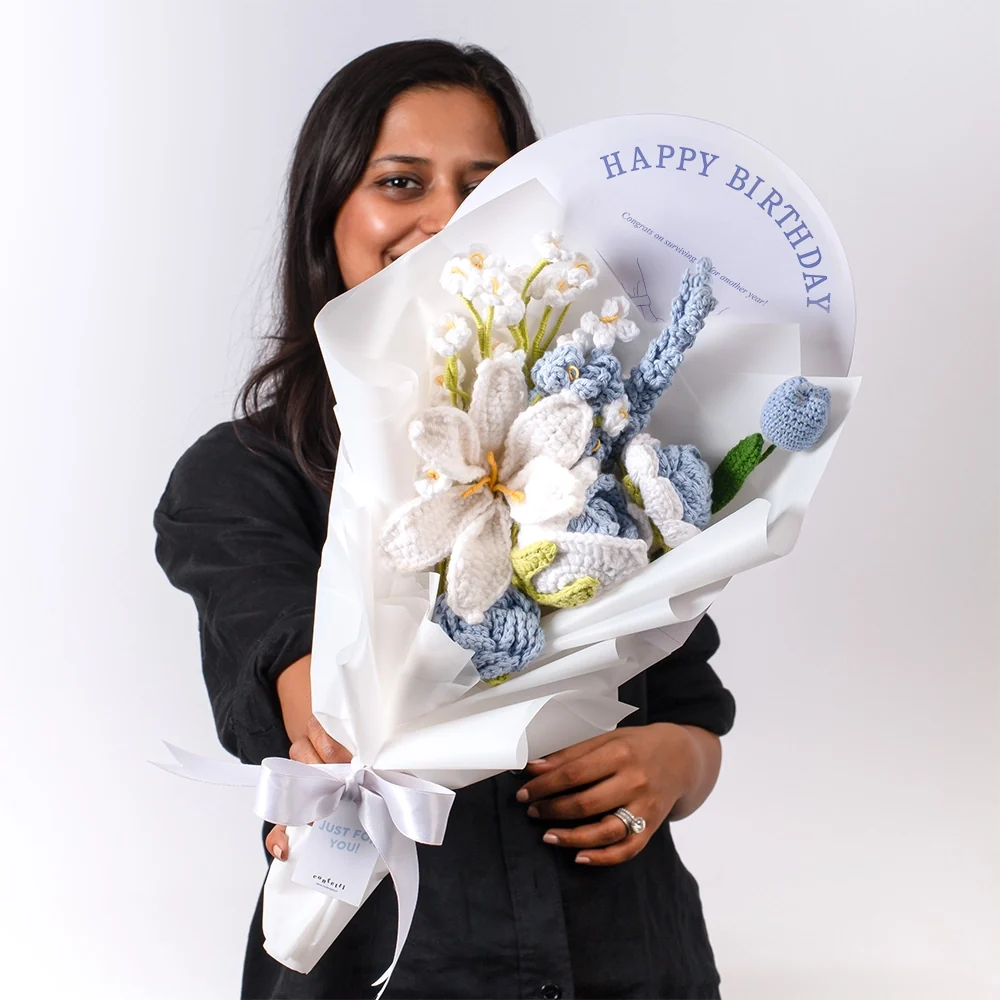 Make this Birthday truly special with our Lily & Tulip Crochet Gift, a beautifully handcrafted flower bouquet that radiates love and care. The bouquet includes: