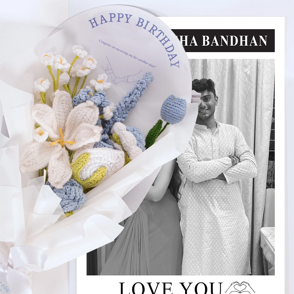 This crochet rakhi gift for brother and sister is presented in a premium bouquet paper, tied with a ribbon, and securely packaged in a shipping box with protective grass and OHP sheet to ensure it arrives in perfect condition. The thoughtful presentation makes it not just a flower bouquet, but a keepsake your loved ones will cherish long after the festivities.